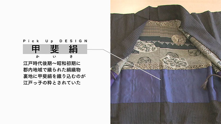 「甲斐絹」という名が誕生するのは、明治になってから。薄さ・軽さ・色の多様さ・模様の複雑さが特徴で、〈見えないおしゃれ〉として羽織の裏地に用いられました。その後、洋装の普及により製造が止まりますが、今も甲斐絹は産地のシンボルであり、その特徴を受け継ぐ織物が生産されています。